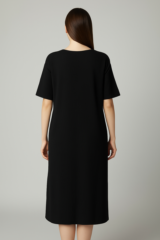 Black Ribbed Midi Dress with Statement Front Patch